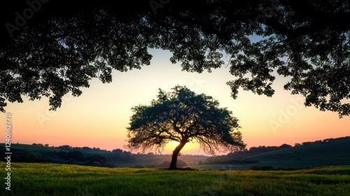 tree, sunset, landscape, silhouette, nature, field, sunrise, golden hour, sky, horizon, summer, evening, rural, scenic, peaceful, tranquil, calm, serene, beautiful, view, countryside, outdoors, scenery, solitude, stillness, quiet, idylli, picturesque, vibrant, warm, colours, orange, pink, purple, green, yellow, light, shadow, dark, branch, leaf, foliage, grass, hill, meadow