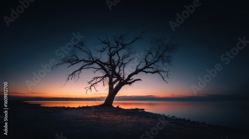 Solitary tree sunset shoreline