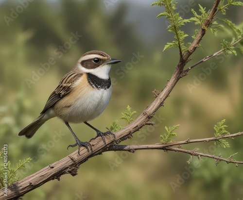 Solitary whinchat saxicola rubetra perched on a twisted branch in a nature reserve, woodland, branchlet, springtime, wildlife sanctuary, bird in the wild