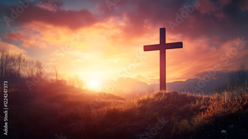 Solitary Wooden Cross Standing Against Sunset in Serene Natural Landscape : Generative AI