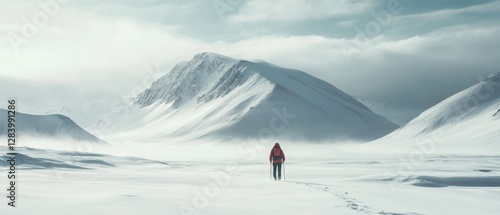 Solo Adventure in Snowy Landscape with Majestic Mountains