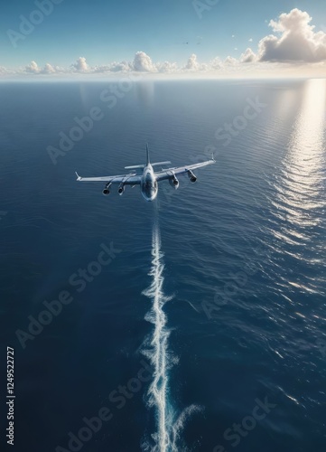Solo aircraft cruising over vast expanse of deep blue ocean meeting horizon at perfect line , ocean, flight