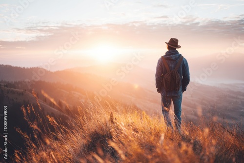 traveler, male, backpack, hat, sunrise, hilltop, grass, mountain, landscape, nature, scenery, horizon, sky, sunlight, silhouette, exploration, adventure, solitude, view, elevation, terrain, wilderness, cloud, distant, scenic, peaceful, tranquil, journey, standing, posture, casual attire, clothing, denim, jacket, boot, gold, light, morning, copy space