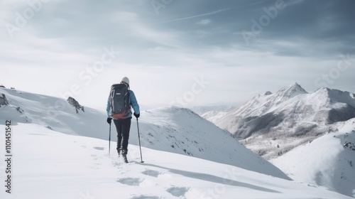 hiker, mountain, snow, winter, landscape, adventure, trekking, travel, nature, outdoors, cold, sky, scene, view, summit, exploration, climb, hill, peak, range, path, journey, exertion, freedom, serenity, solitude, peace, calm, white, blue, grey, ice, frost, pole, backpack, clothing, boot, person, sport, alpine