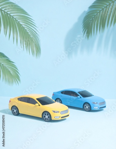 some cars, yellow black and blue on stage display, palm leaves shadow