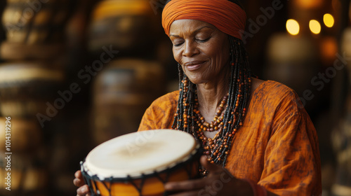 Someone playing soft music with a hand drum, A woman in traditional attire plays a drum, showcasing cultural heritage and musical talent in a vibrant setting filled with art.