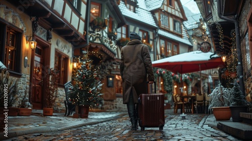 Someone rolling a suitcase through a charming cobblestone plaza, immersing in the charm of a European town.