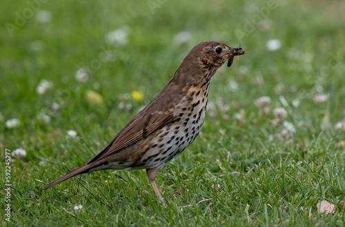 Song thrush bird with a worm on its beak