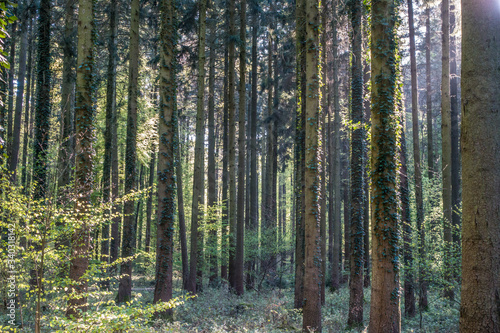 Sonnenstrahlen scheinen auf Waldweg