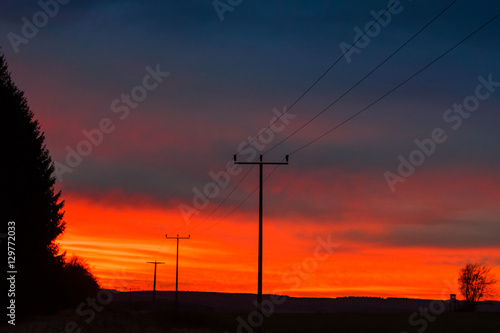 evening sky, evening scene, energy, resin, heaven, night, night sky, sun, sunset, forest, countryside, duct, pylon, orange, red, pylon