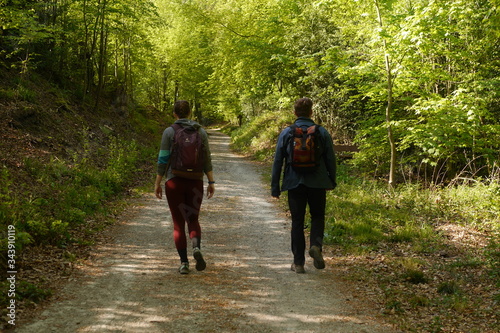 hike, forest, backpack, pathway, nature, people, tree, park, rail, family, woman, autumn, couple, outdoors, green, road, forest, recreation, summer, exercise, hike, sport