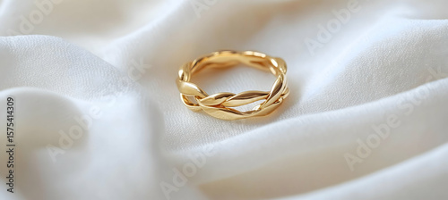 Sophisticated closeup of a premium gold wedding ring glowing on a white cloth background with intricate metalwork and minimalist composition