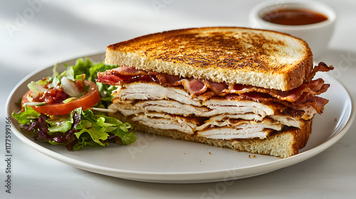 Sophisticated Club Sandwich with Bacon and Fresh Salad Presentation