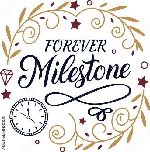 Sophisticated Forever Milestone Label Design Featuring Elegant Swirls, Stars, and Clock Accents for Celebrating Timeless Love and Life's Significant Moments