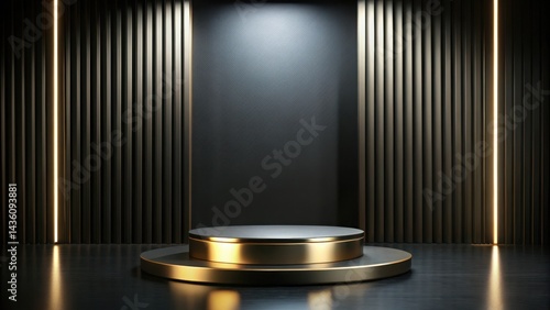 Sophisticated luxury product showcase on a sleek black stage with a gold pedestal, set against a dark backdrop perfect for high-end product displays , luxury, display