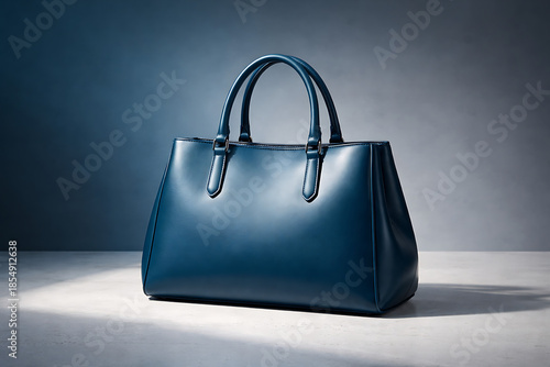 Sophisticated navy blue smooth leather tote bag with structured design and double handles placed on a white stone surface for professional office fashion photography