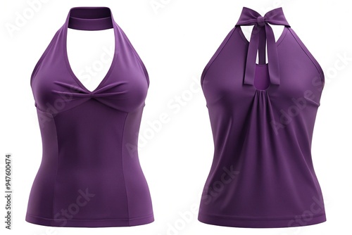 Sophisticated plum purple blouse boasts a classic fit and halter neck design, showcasing intricate details on both the front and back of the garment.