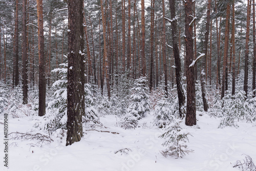 Sosnowy las w śnieżny, zimowy dzień.