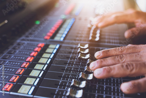 sound engineer hands working on sound mixer in live concert