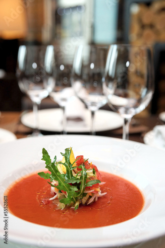 andalusia, broth, cold, cookery, diet, flatware, food, fresh, gazpacho, healthy, herb, herbal, liquid, mediterranean, organic, pea, plate, tomatoes, refreshment, eatery, soup, squash, summer, traditional, vegetable, white, table, setting, arrangement, place, glasses, dining, meal, expensive, clothes, wine glass, crockery, tableware, silver, indoor, interior, dark, nobody