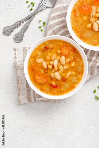 Soup with beans and vegetables in a bowl on a gray concrete background top view. Soup from lentils, chickpeas, beans, carrots, peppers, and tomatoes. Tasty vegan soup, vegetarian food. Copy space