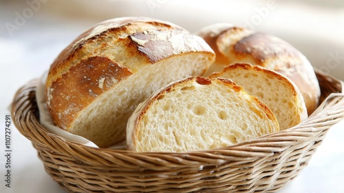 sourdough bread in a basket, with a few slices cut and displayed. The bread's crust is golden and slightly cracked, with the soft interior visible inside.