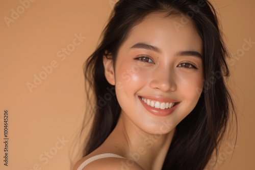 portrait, adult, background, woman, person, brown background, fashion, make-up, beige, smile, smiling, yellow background, asian, photo, face, thai, beautiful, happy, human, teeth, head, close, south, east, happiness, eyelash, dreamy, female, image, nose, real, skin, closeup, young adult, copy space, bodycare, coiffure, long hair, cheerful, head shot, eyebrow, glamour, neck, chin, cheek