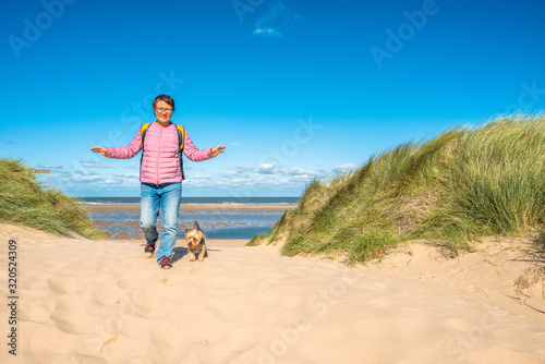 South Korean woman with dog on sand dunes where Norfolk Coast path National Trail from Burnham Overy Staithe reaches the sea, East Anglia, England, UK
