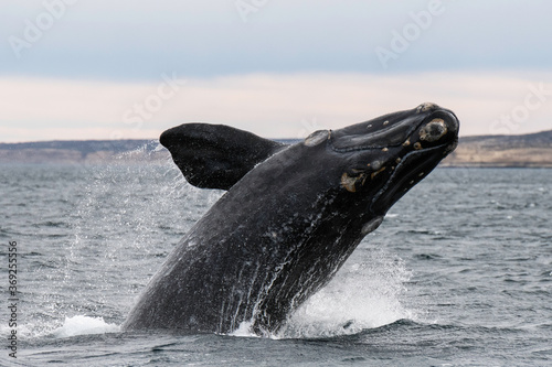 Southern Right Whale, Eubalaena australis, breaching, Nuevo Gulf, Valdes Peninsula, Argentina, a UNESCO World Heritage site.