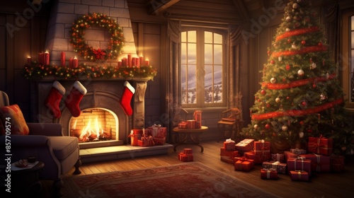 Сozy Christmas living room with a beautifully decorated Christmas tree, a roaring fireplace, stockings hung on the mantel, and presents under the tree, warm lighting