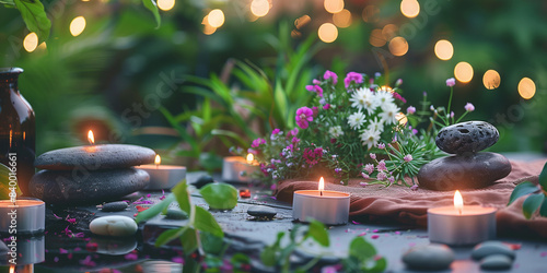 Spa Massage einer Frau mit Kerzen Ölen und weiteren Deko