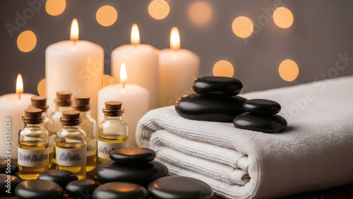 Spa Massage Setup with Smooth Stones, Candles, and Aromatherapy Oils for Relaxation