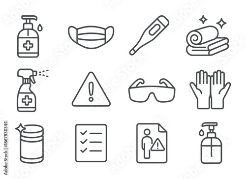 Spa Safety Icons. Outline icon set of spa and wellness safety: sanitizer bottle, mask, thermometer, clean