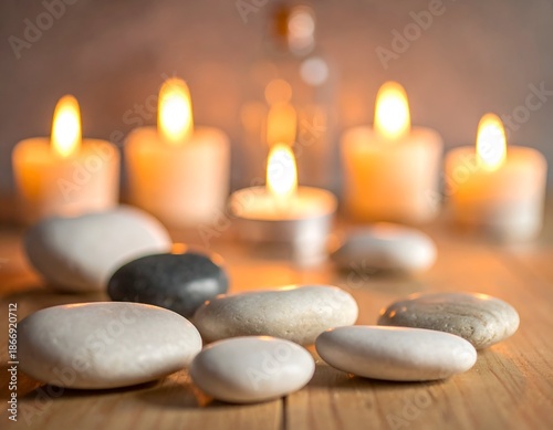 Spa setting with lit candles, smooth stones, and a blurred background