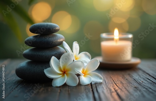 Spa still life composition with stones pyramid, frangipani plumeria flowers and candle. Zen like mood is perfect for wellness presentation, relax, therapy, massage and body care.