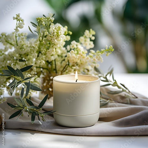 Spa still life, Spa Day, Relaxation, Towel with white lit candle and white flowers, blurred background, Zen, serenity