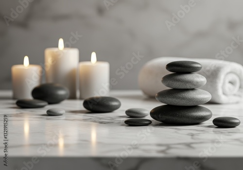 Spa stones arranged on a white marble table.