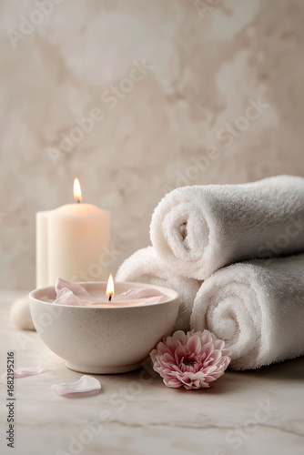 Spa table with candles, towels and flowers