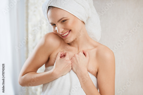Spa Woman. Portrait of smiling young woman in towel in bathroom.