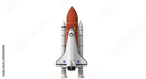 space, shuttle, rocket, launch, aerospace, technology, transportation, white, isolated, science, future, exploration, engineering, flight, spacecraft, vehicle, design, structure, vertical, perspective, top, view, colours, orange, red, blue, detail, wing, fuselage, nozzle, engine, booster, payload, orbit, atmosphere, journey, travel, concept, realistic, illustration
