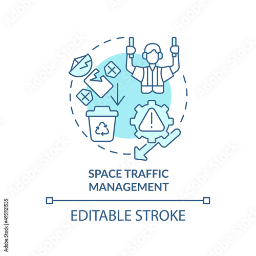 concept, icon, line, editable, space, traffic, management, technology, exploration, trend, safety, science, research, development, garbage, spacecraft, provision, access, debris, satellite, junk, threaten, retrieval, aerospace, advancement, stroke, abstract, illustration, linear, vector, logotype, art, outline, pictogram, infographic, general, web, graphic, drawing, thin, complex, symbol, colours, round, circle, modern, flat, blue