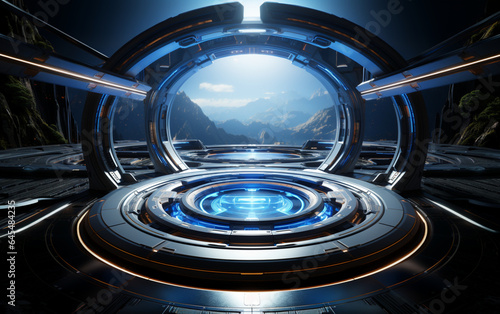 Spaceship corridor. Futuristic tunnel with light, laboratory, spaceship interior, futuristic portal, Generative AI