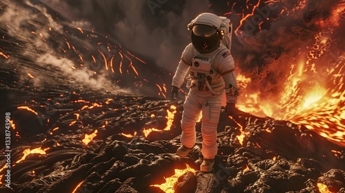 astronaut, space, volcano, lava, flames, fire, eruption, science fiction, cosmic, adventure, exploration, outer space, hero, science, surreal, futuristic, space-travel, heat, interplanetary, vivid colors