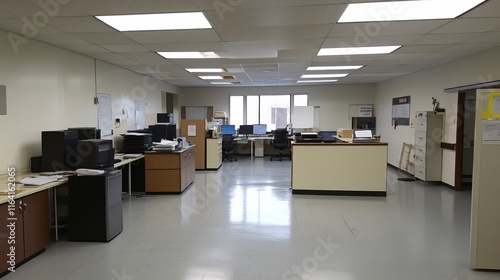 office, workspace, interior, furniture, desk, computer, cabinet, storage, lighting, wall, professional, organisation, clean, minimal, corporate, productivity, environment, modern, equipment, technology, administrative, layout, flooring, window, business, efficiency, comfort, practical, functional, collaboration, open space, workstation, utility, aesthetic, arrangement, decor, supply, design, maintenance, cleanliness, atmosphere, white, beige