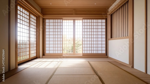 Spacious, bright, zen-like Japanese interior design. Sunlight streams through traditional shoji screens and sliding doors. Tranquil, minimalist, wooden walls, tatami mats, interior, modern, peaceful,