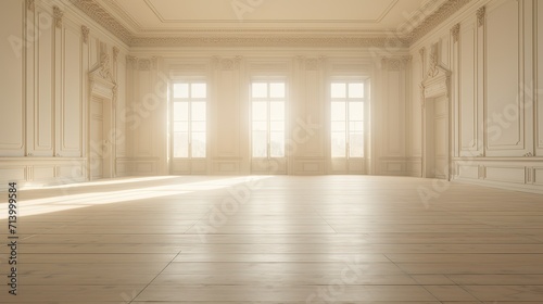 Spacious classical room flooded with natural sunlight pouring through tall French windows, featuring ornate period-style wall paneling and a herringbone parquet floor.