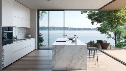 Spacious coastal kitchen with a sleek marble island, overlooking the water through expansive glass windows.