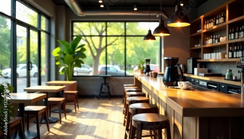 Spacious coffee bar, wooden counter, abundant natural light, inviting, interior