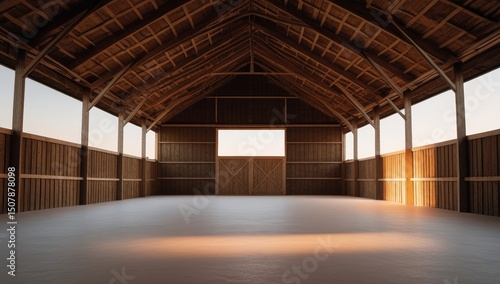 Spacious Empty Barn Interior with Wooden Structure and Natural Light