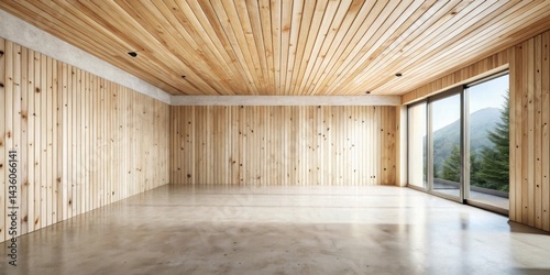 Spacious Empty Room with Wood Walls and Floor, Large Window Offering a Mountain View